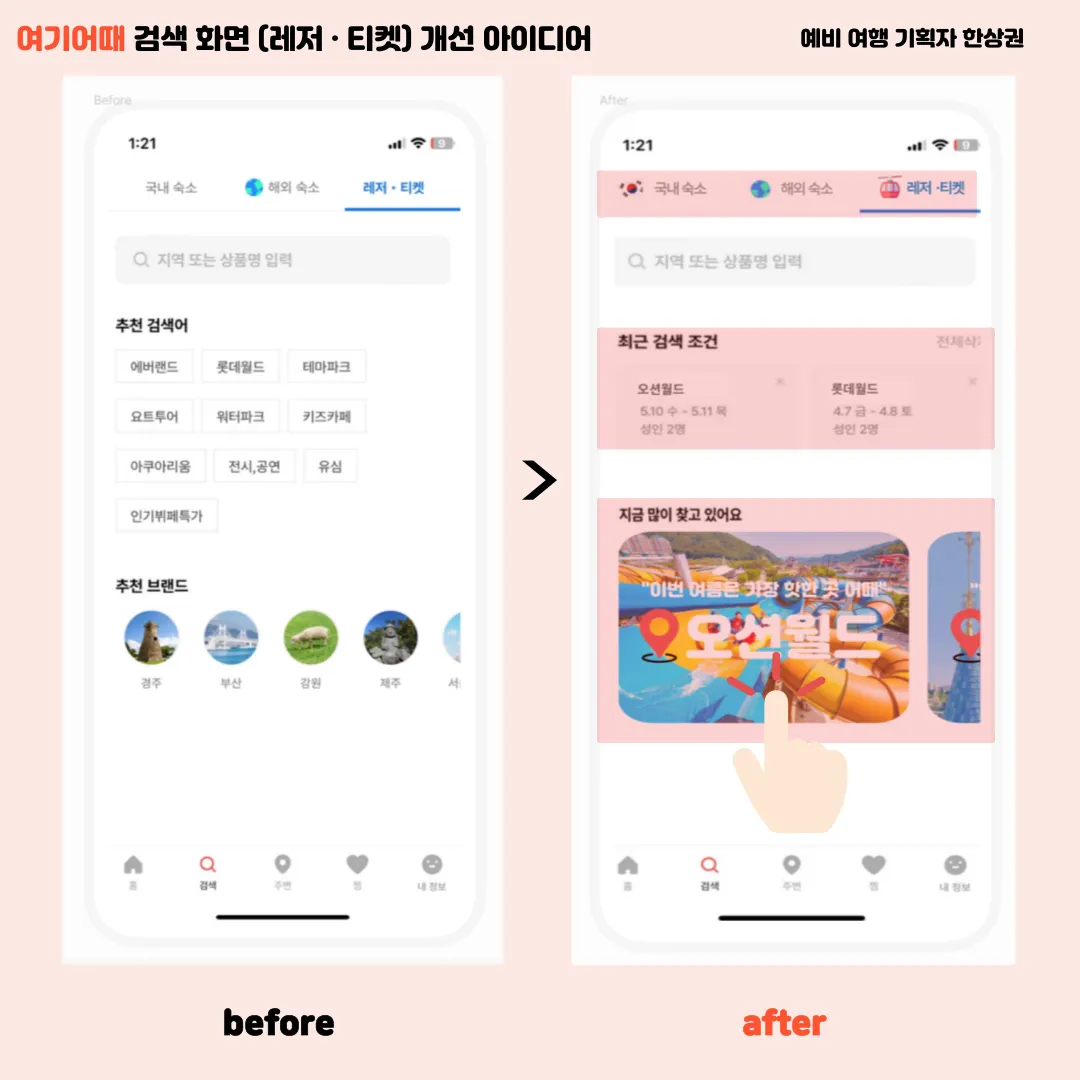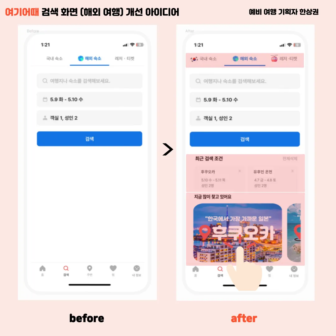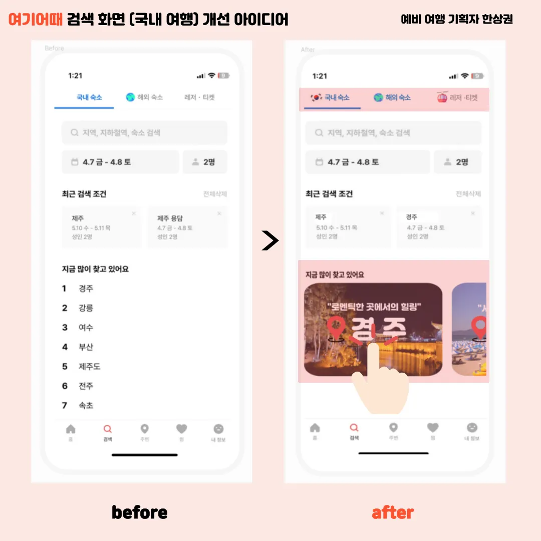 장점 | ● 국내 숙소와 레저 ∙ 티켓의 순위와 추천 검색어 기능을 통해 우회 없이 클릭 한 번으로 해당 사이트에 접속할 수 있다. ● 레저 ∙티켓 화면 ‘추천 브랜드’ 사진이 작은 동그라미 형태로 구성되어 있다. → 사용자가 한 화면에 다양한 추천 지역을 확인할 수 있게 하게끔 위함이다. ● 해외숙소가 국내 숙소와 레저 ∙ 티켓 네비게이션 가운데에 있고, 유일하게 아이콘이 있다. → 국내숙소가 아닌 해외숙소에 관한 공간임을 사용자에게 확실히 인지시키기 위함이다. | ● 국내 숙소, 해외 숙소, 레저∙ 티켓 네비게이션 속 모두 아이콘을 통일성 있게 적용하면서 상단 네비게이션과 글씨의 대칭 문제를 바로잡았다 ● 세 화면 구성을 ‘최근 검색 조건’과 ‘지금 많이 찾고 있어요’로 통일했다. 사용자가 숙소를 검색할 때 필요할 것 같은 정보를 바탕으로 짧은 시간에 숙소를 검색할 수 있게 학기 위함이다. ‘ ● ‘지금 많이 찾고 있어요’ 속 앱 속에서 가장 많이 찾아지고 있는 지역 5곳을 5:4 사진 크기로 확대된 여기어때체와 함께 구성했으며, 사진을 누르면 숙소가 추천되는 숏폼으로 전환된다. → 시력이 좋지 않는 사용자도 한 눈에 가장 인기있는 지역과 추천하는 숙소들을 파악할 수 있게 하기 위함이다. |