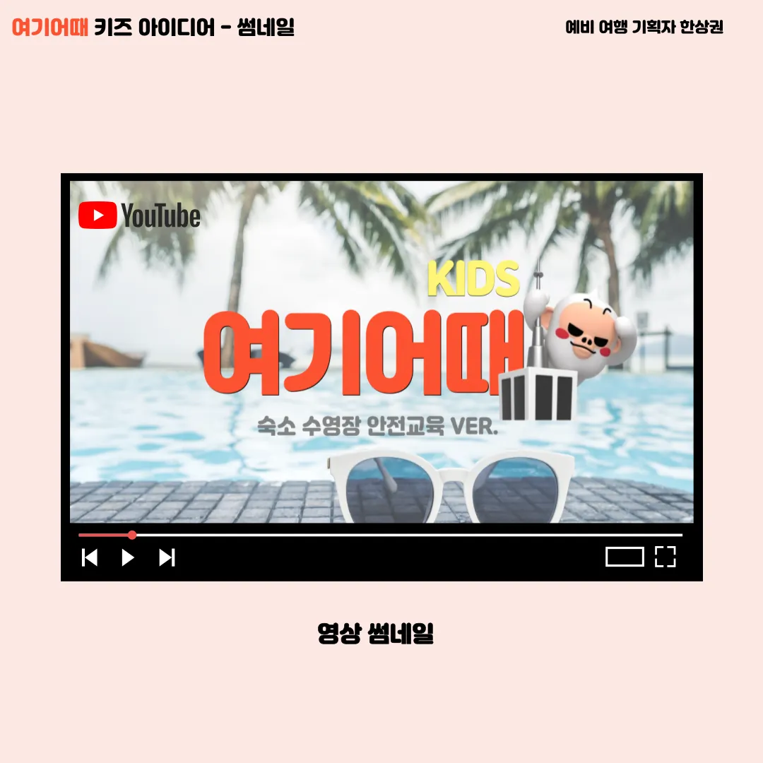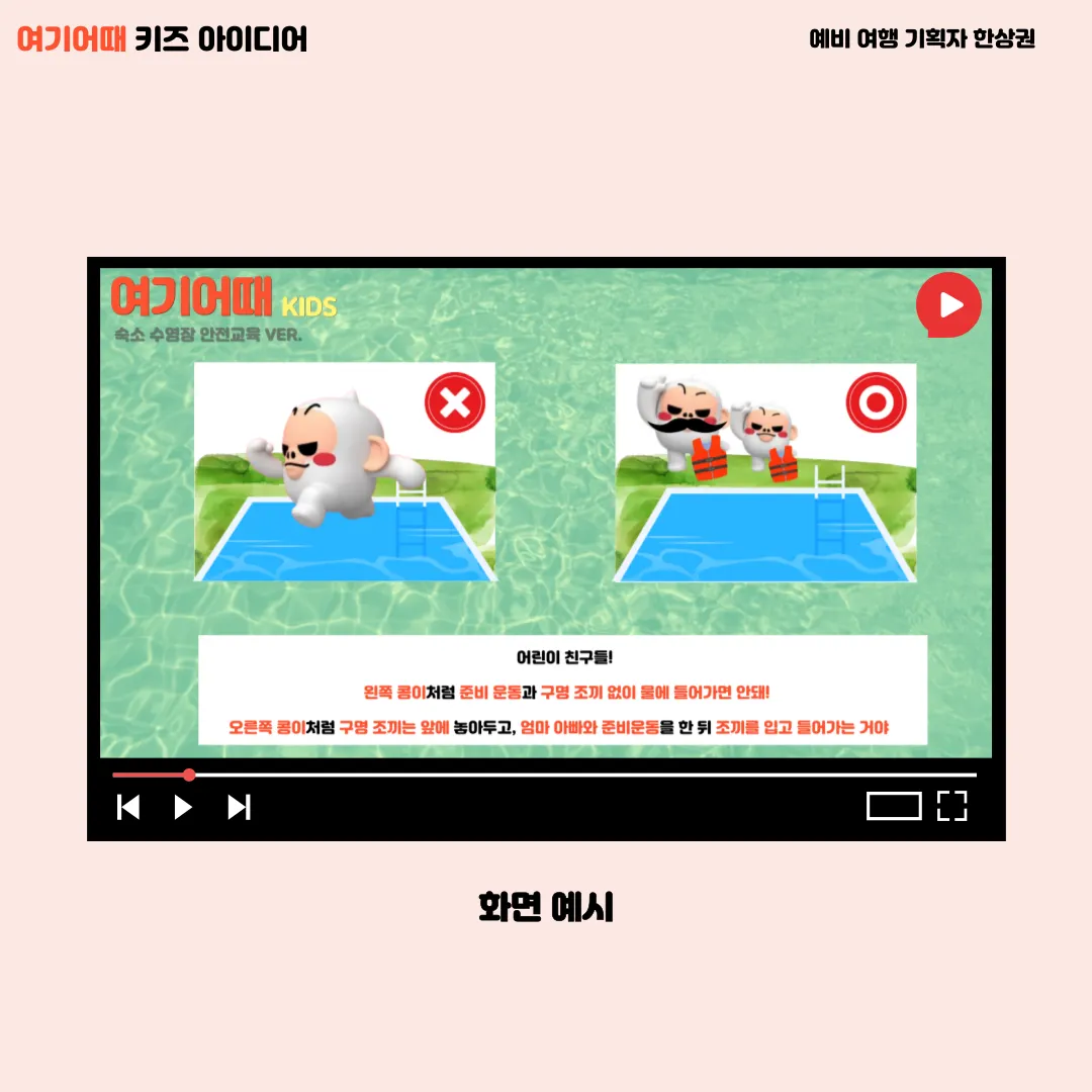 내가 여기어때의 기획자가 되어 어린아이들에게 조금 더 친근하게 접근 가능한 콩이를 활용한 ‘키즈 숙소 안전 애니메이션’을 기획해보았다. 영화관에도 영화가 시작되기 전 캐릭터를 이용해 안전사항을 강조시키는 짧은 애니메이션이 있는데, 숙소 이용 시 어린 아이들의 안전사고를 방지하기 위한 인지책은 반드시 있어야한다. 고객의 안전까지 고려하는 친근하고 섬세한 여기어떄의 이미지를 아이들의 부모들에게 크게 강조시킬 수 있어 이슈화가 가능하고 앱 관심도와 이용도 모두 올라갈 것이다.