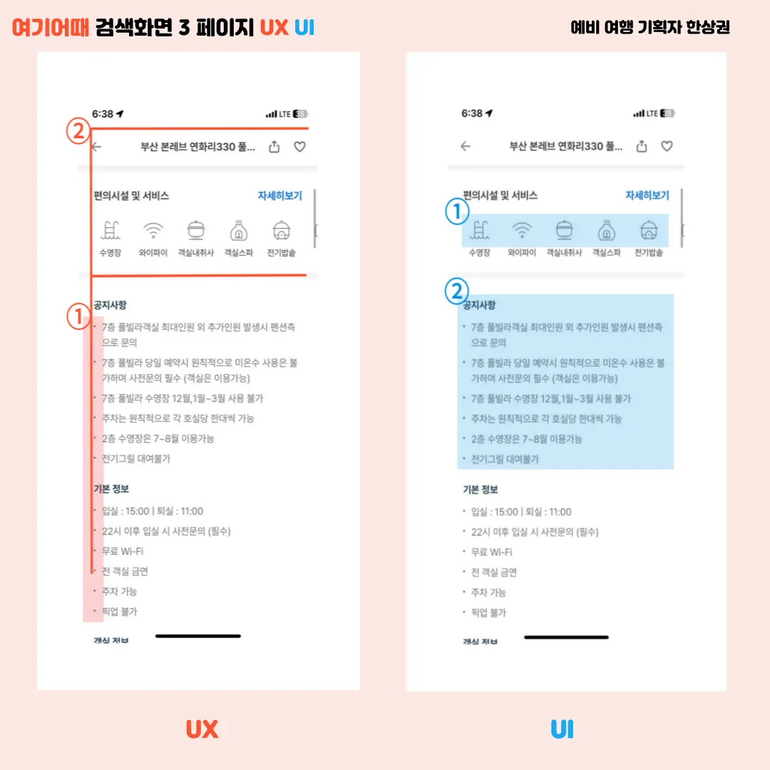 ● 사진에 먼저 시선에 가는 사용자의 시각적 특징 상, 숙소명이 상단에 배치되어 있어 시각적 불편함이 있다.