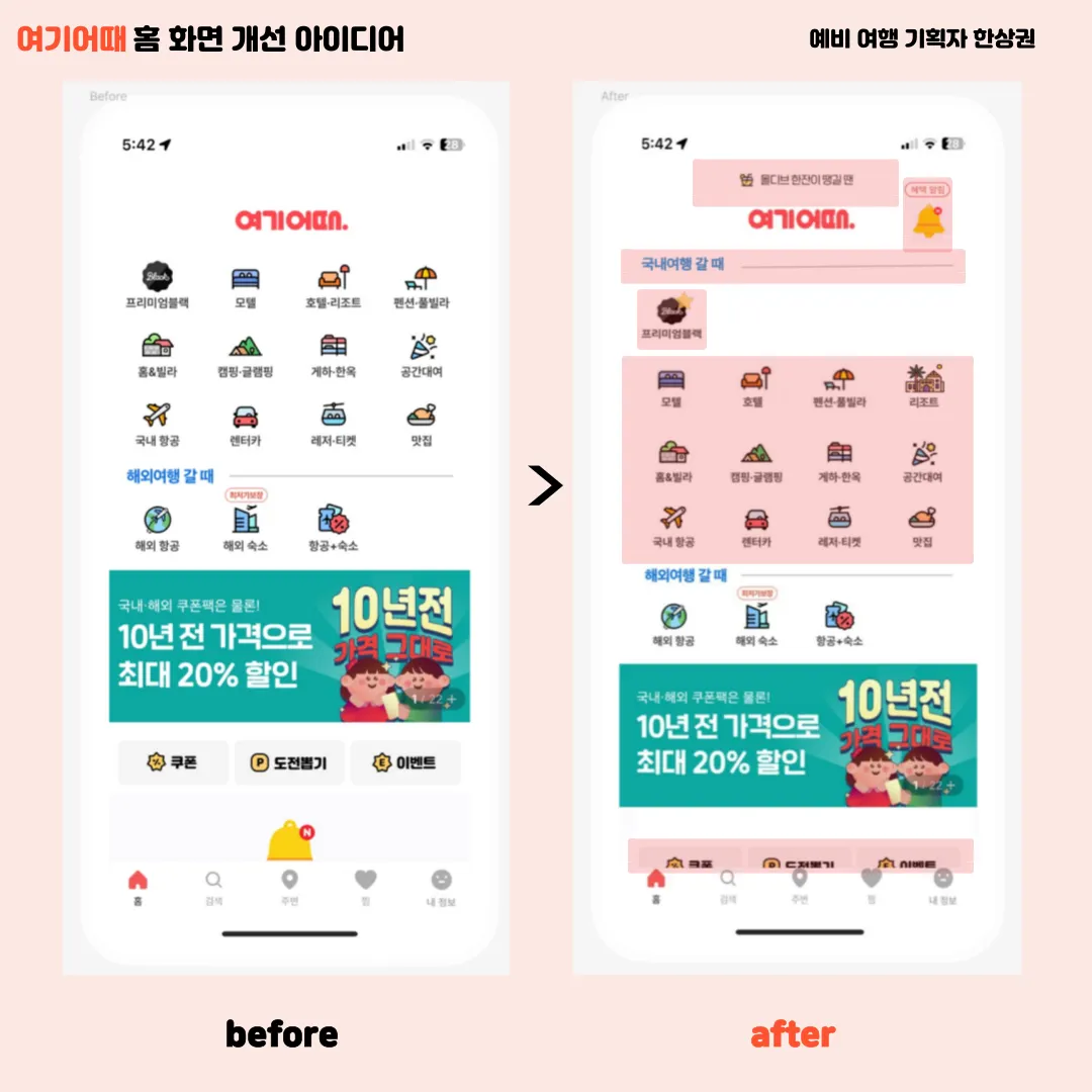 장점 | ● 국내 여행 앞 줄에 사용자들이 자주 이용하는 서비스 4가지를 배치했다. → 사용자가 한눈에 서비스를 파악하고 이용할 수 있게 하기 위함이다. | ● 여기어때 내 프리미엄 서비스인 프리미엄 블랙을 아이콘 배열 최상단에 배치하고, 별 이모티콘을 추가했다. → 앱을 처음 사용하는 사용자도 프리미엄 블랙의 특별함을 한 눈에 확인 할 수 있게 하기 위함이다. ● 리조트 서비스를 호텔 서비스에서 분류했다. → 사용자가 보다 더욱 풍부한 양 리조트를 찾을 수 있게 하기 위함이다. ● 혜택 알림 종 아이콘을 우측 상단 이동시켰다. → 사용자가 스크롤 없이 종 아이콘의 기능을 한 눈에 확인하게끔 위함이다. ● “몰디브 한 잔이 땡길 땐”과 같은 문구를 화면 최상단에 배치했다. → 사용자가 이를 확인하고 보다 앱을 친근하게 즐길 수 있게 하기 위함이다. ● 국내여행과 해외여행 서비스의 제목 ‘~여행갈때’를 통일시켰다. |
