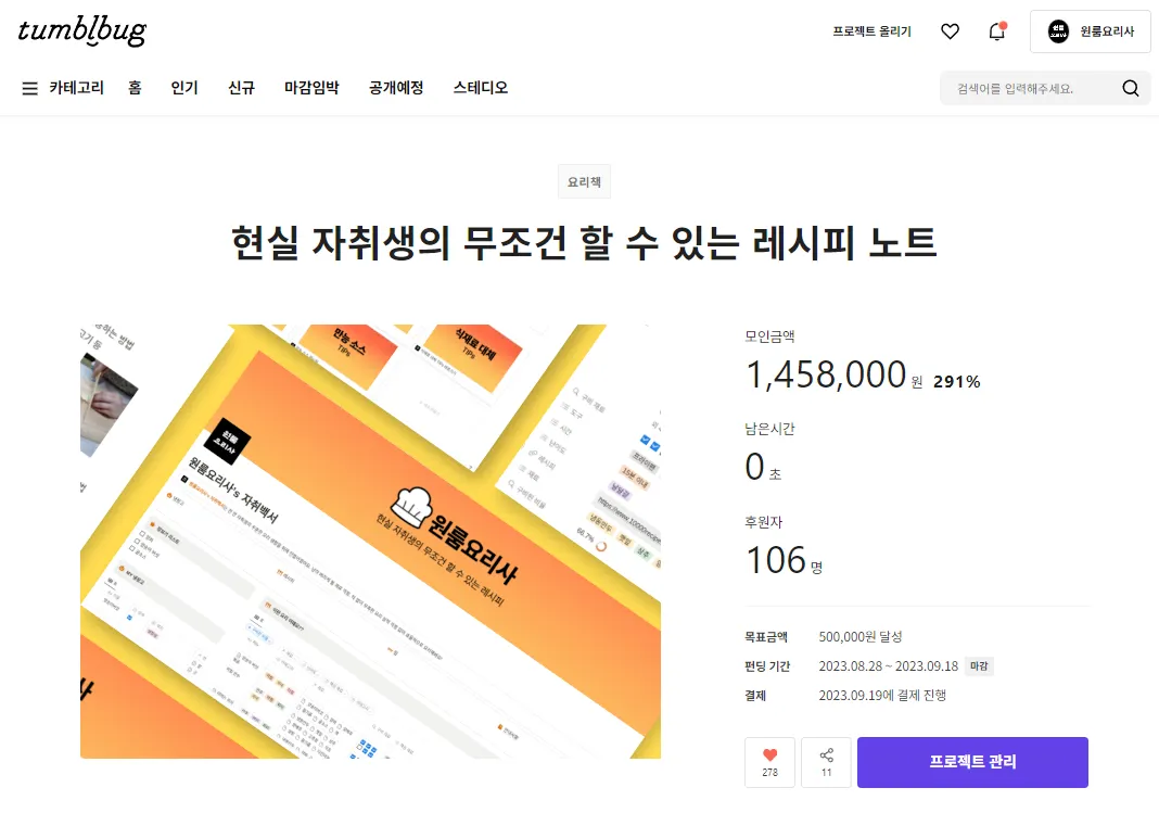 텀블벅 291%달성 성공