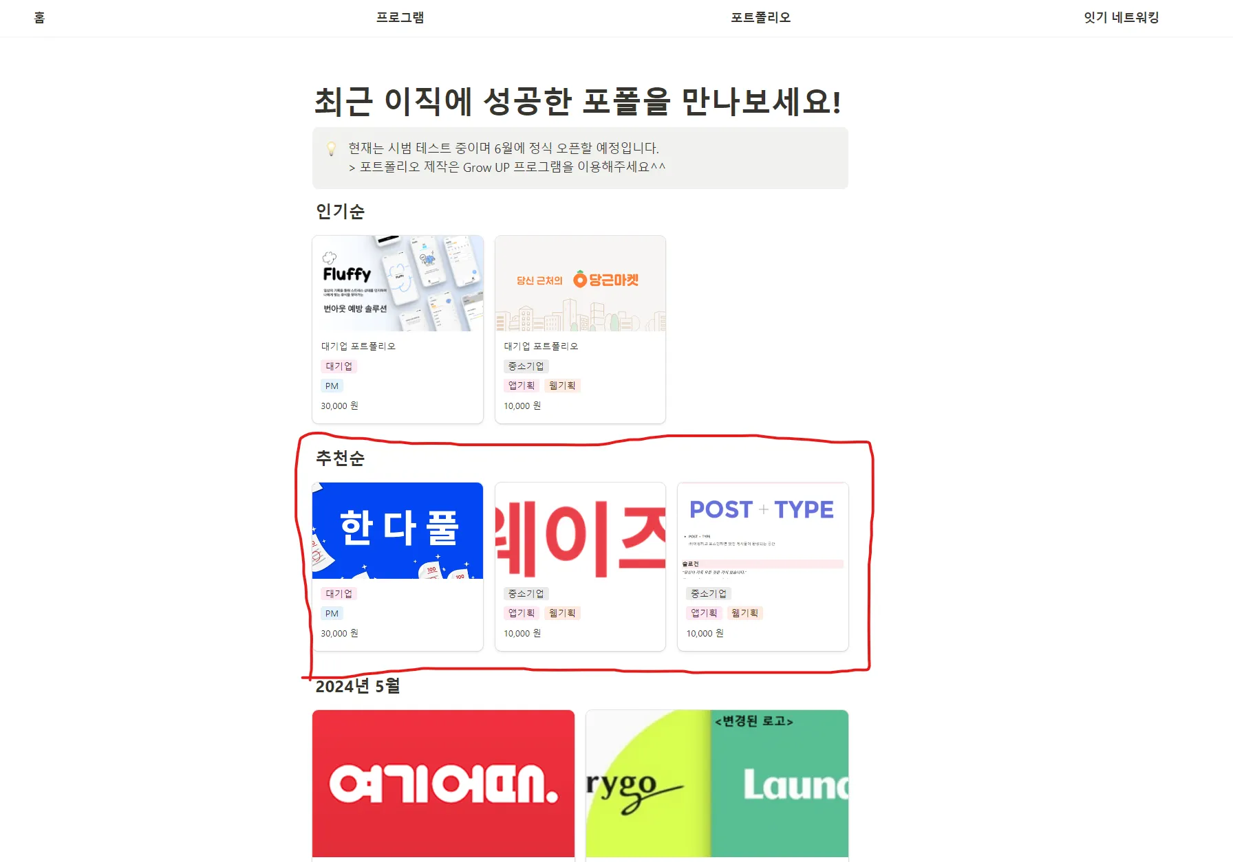 메뉴 → 포트폴리오 → 현직자 포폴보기