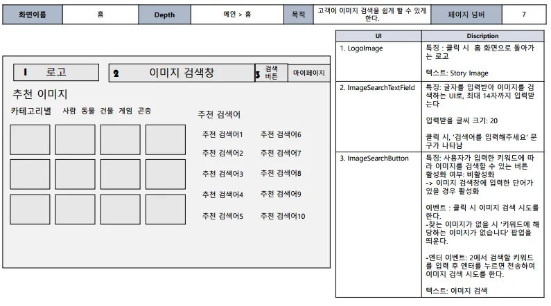 메뉴트리 페이지에서는 ‘스토리이미지’ 서비스에 들어갈 메뉴들과 페이지들을 정의했으며,기능정의서 페이지에서는 ‘스토리이미지’ 서비스에 들어갈 기능들에 대해 정의하고 설명하였습니다.