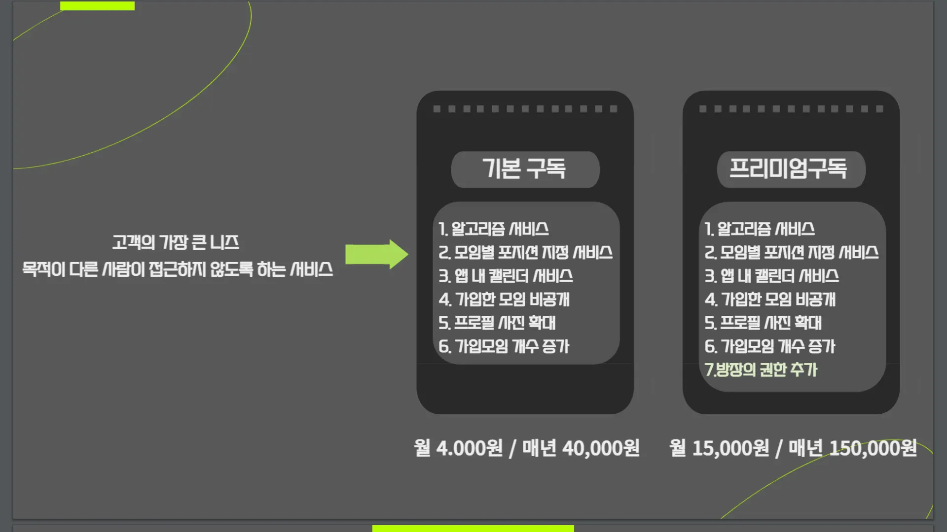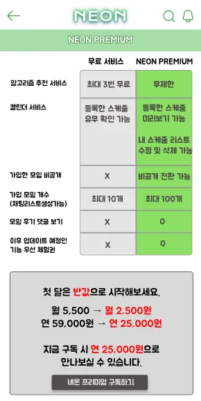 구독 서비스 소개 ; 알고리즘 추천 시스템, 스케줄 상세보기, 모임 후기 댓글 보기 등